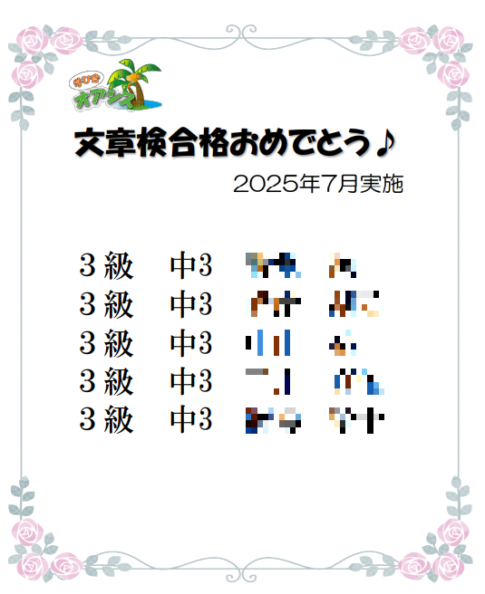 ※個人情報保護のため、個人名が分からないように加工しています。教室にはお名前が分かる形で掲示しています。